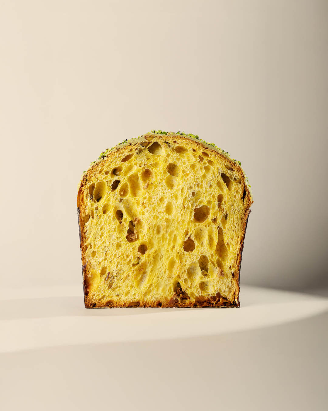 Ingredienti: farina di grano tenero tipo 00, burro (latte), zucchero, tuorlo d’uovo pastorizzato allevato a terra, pistacchio di Bronte DOP, cioccolato bianco, cioccolato al caramello (pasta di cacao) lievito madre (glutine), miele d’acacia, sale, pasta di arancia, pasta di mandarino, pasta di limone, malto in polvere, baccelli di vaniglia del Madagascar, scorza di limone, scorza d’arancia.